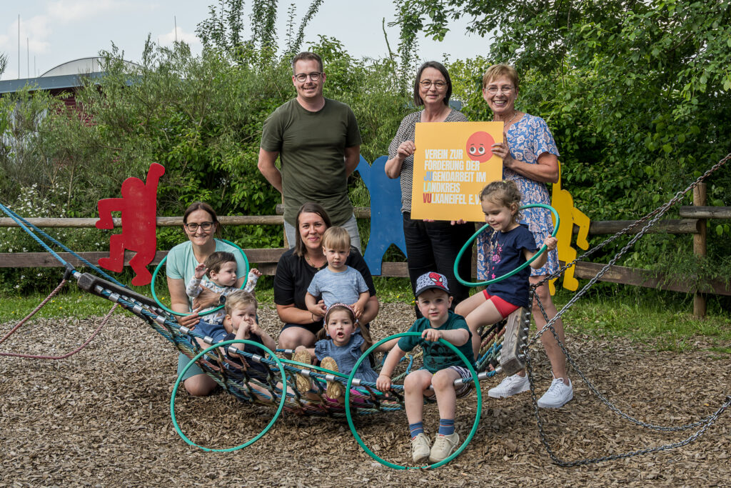 Die jüngsten Sportler und ihre Eltern freuen sich über die angeschafften Spielgeräte.